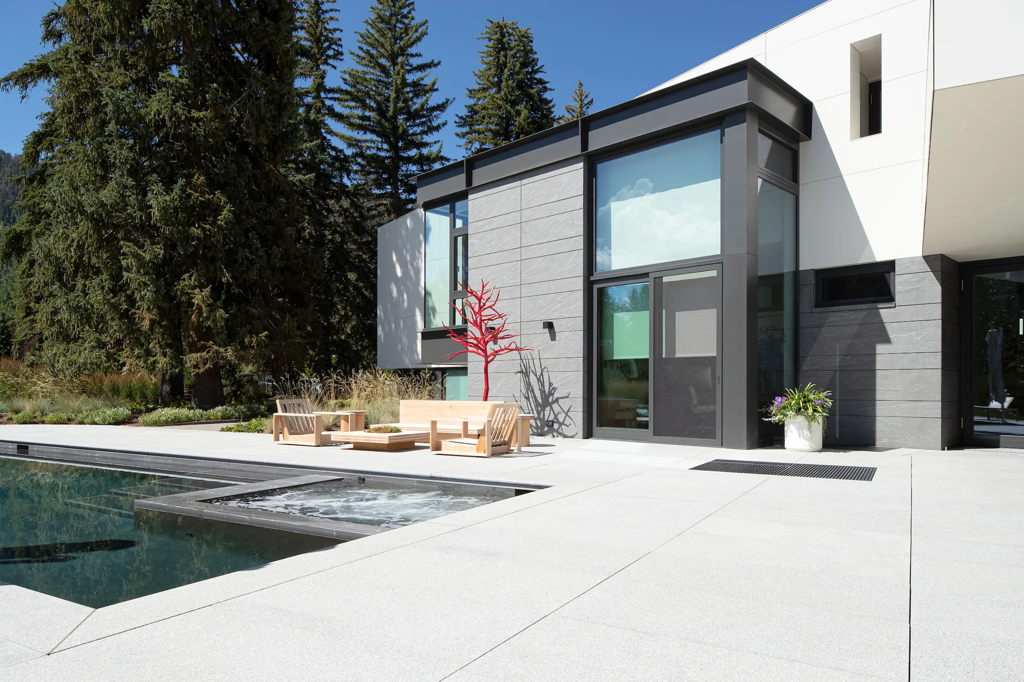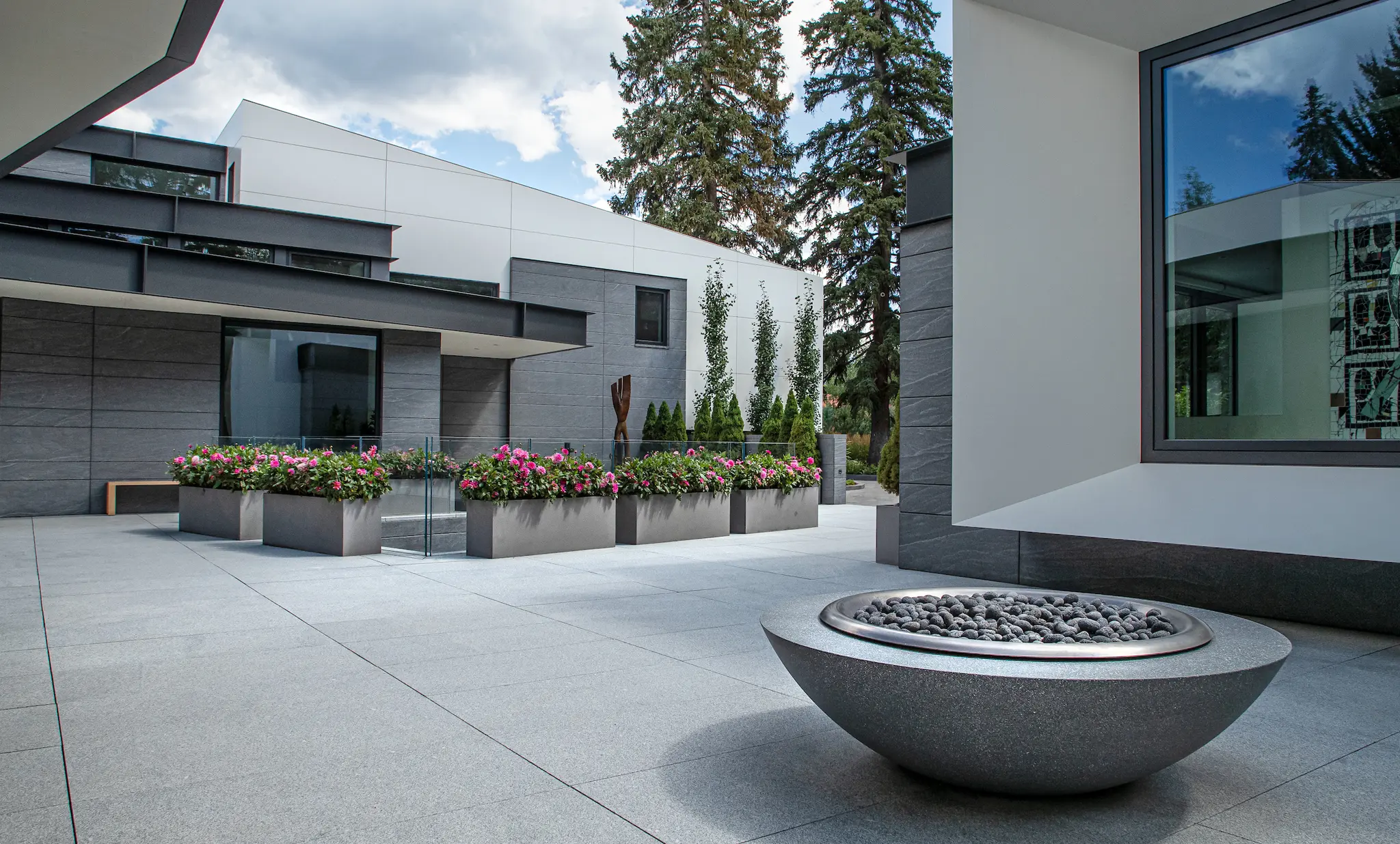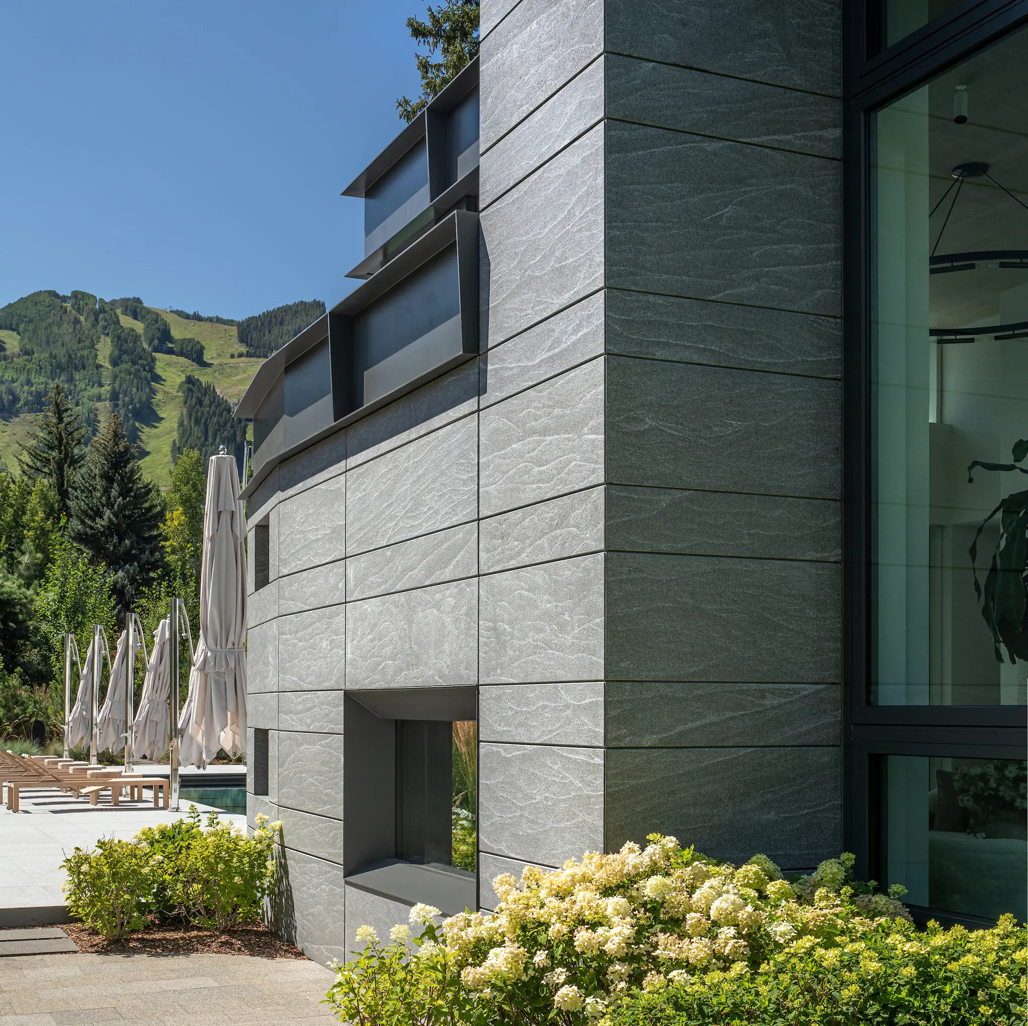 This private residential project features highly refined granite cladding and paving systems executed with exceptional precision and material control. Jet Mist granite quarried in Virginia was selected for the exterior cladding, with careful attention given to color consistency, veining direction, and finish across elevations. The stone was custom processed with a burnished surface and hand-flamed, brushed detailing to achieve a uniform, subdued texture.