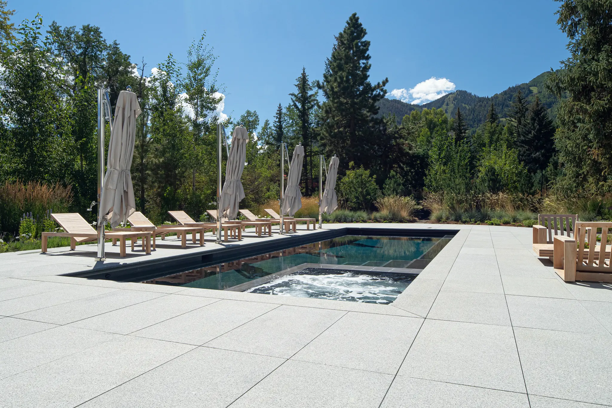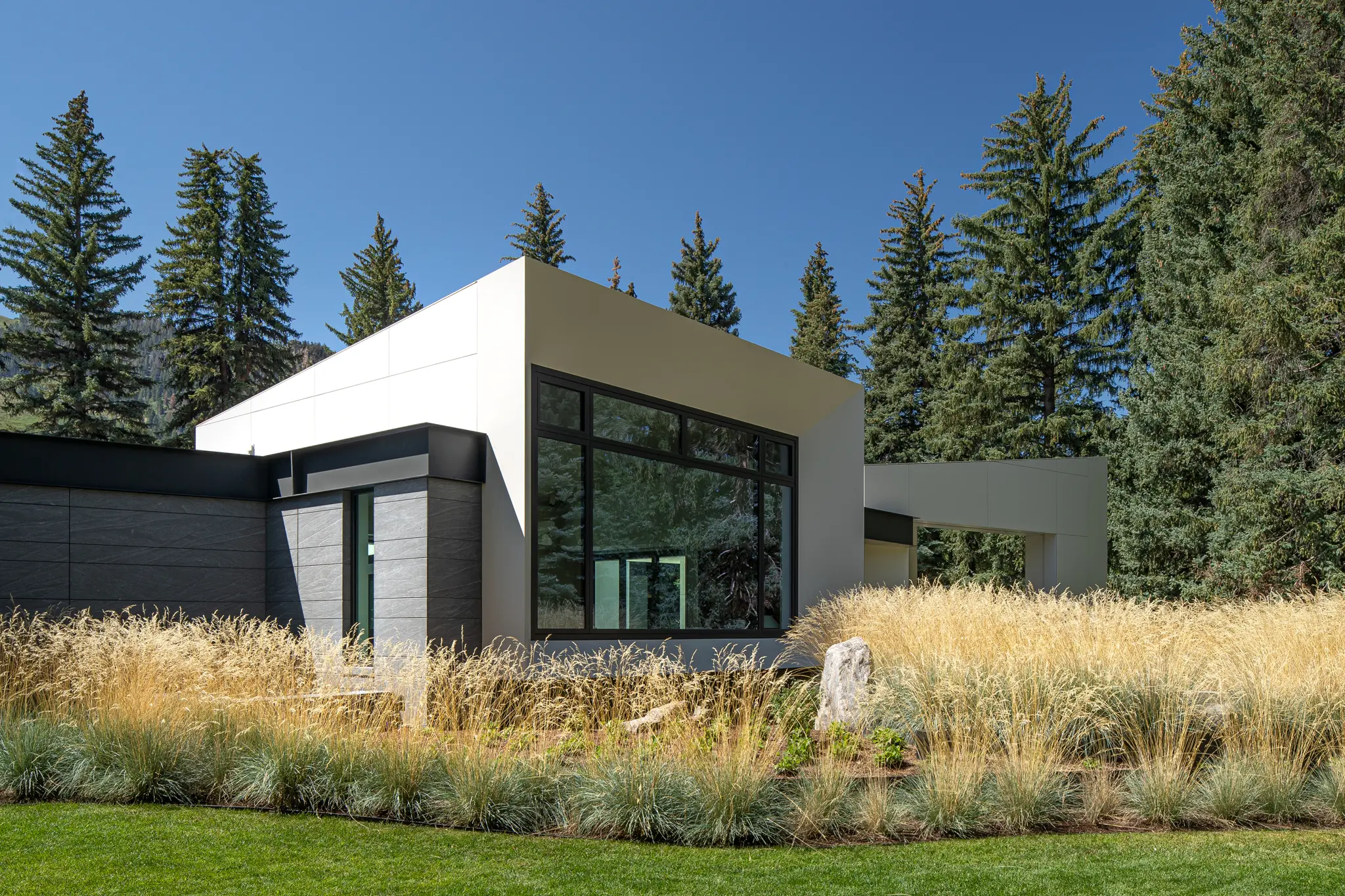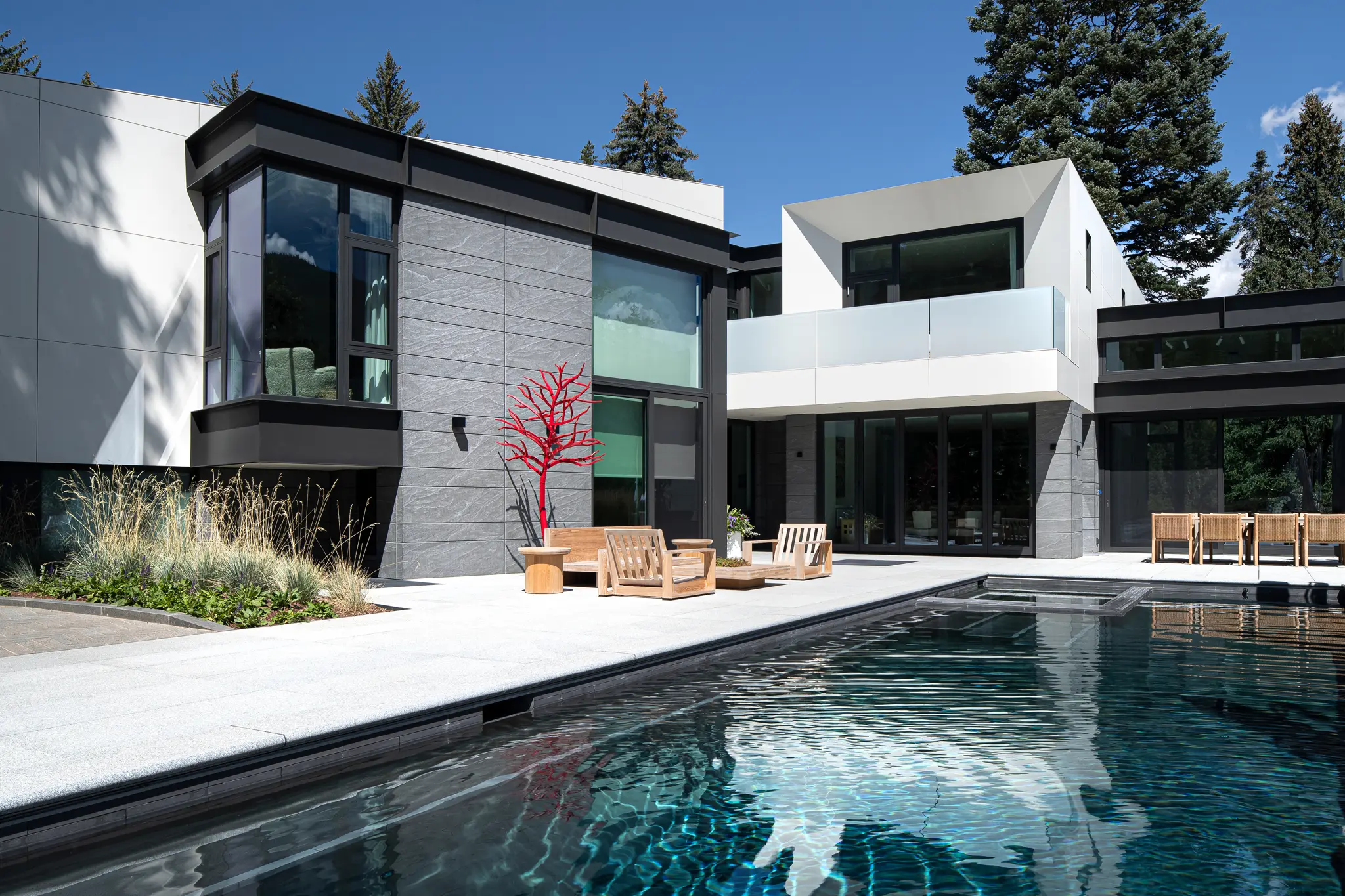 This private residential project features highly refined granite cladding and paving systems executed with exceptional precision and material control. Jet Mist granite quarried in Virginia was selected for the exterior cladding, with careful attention given to color consistency, veining direction, and finish across elevations. The stone was custom processed with a burnished surface and hand-flamed, brushed detailing to achieve a uniform, subdued texture.