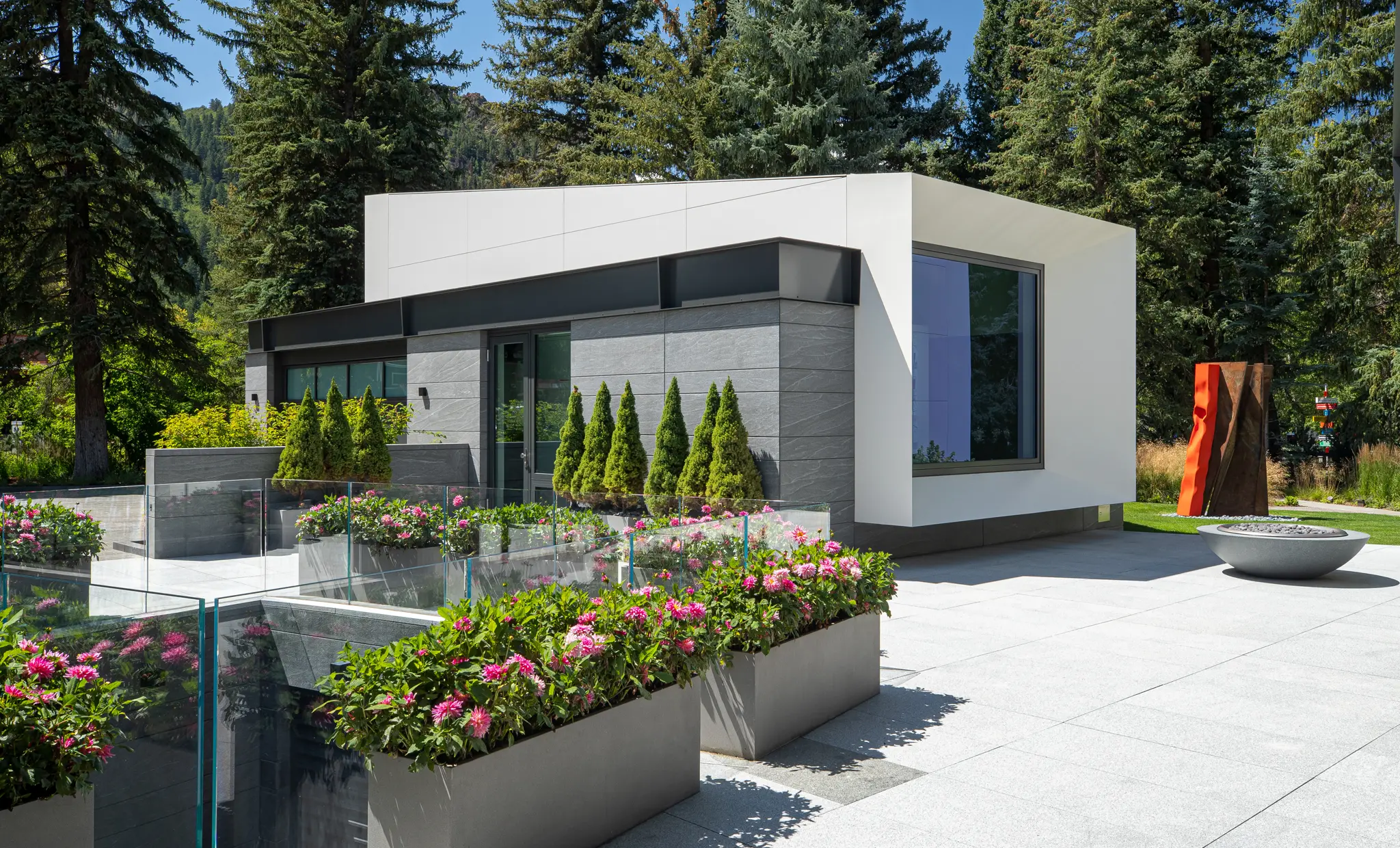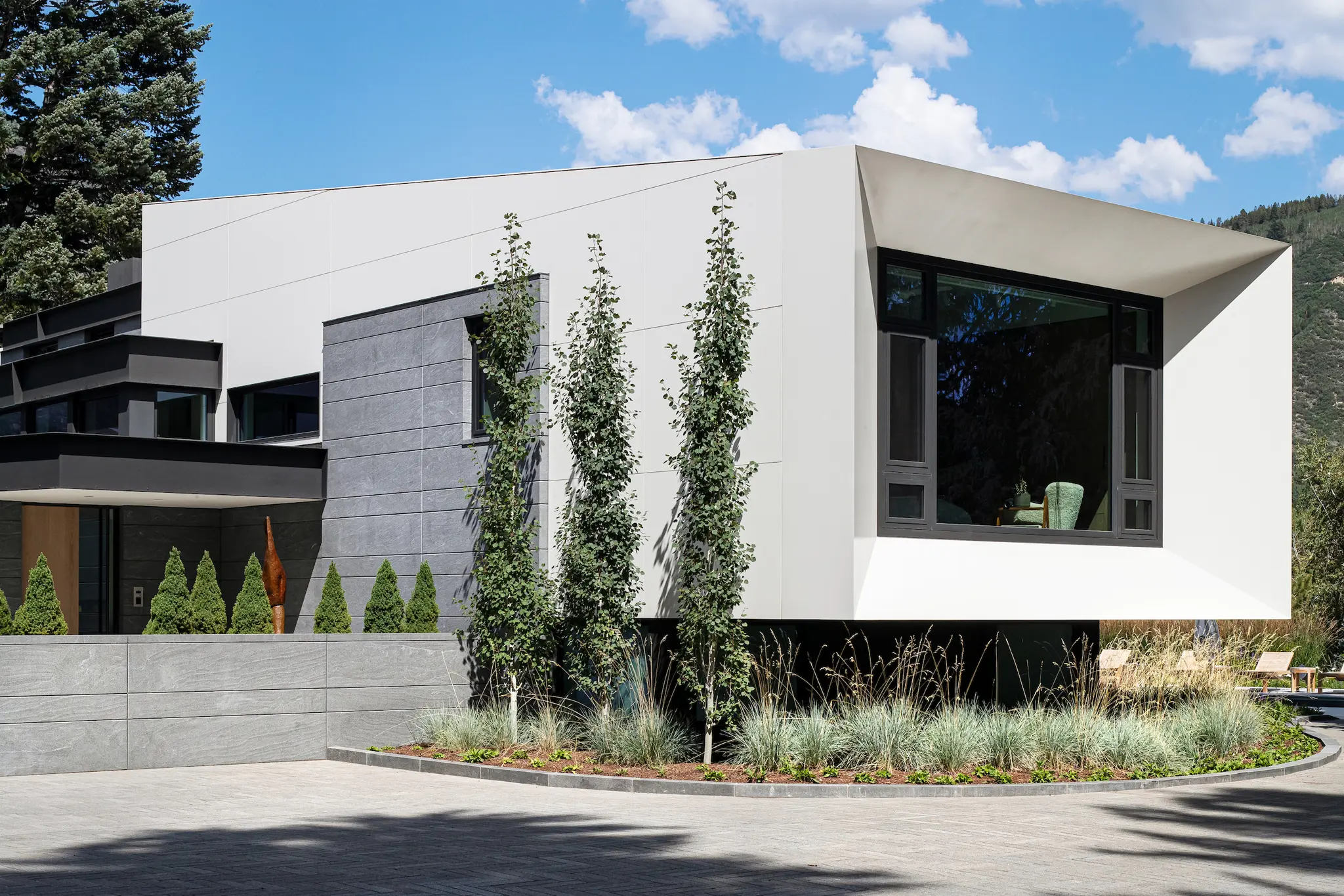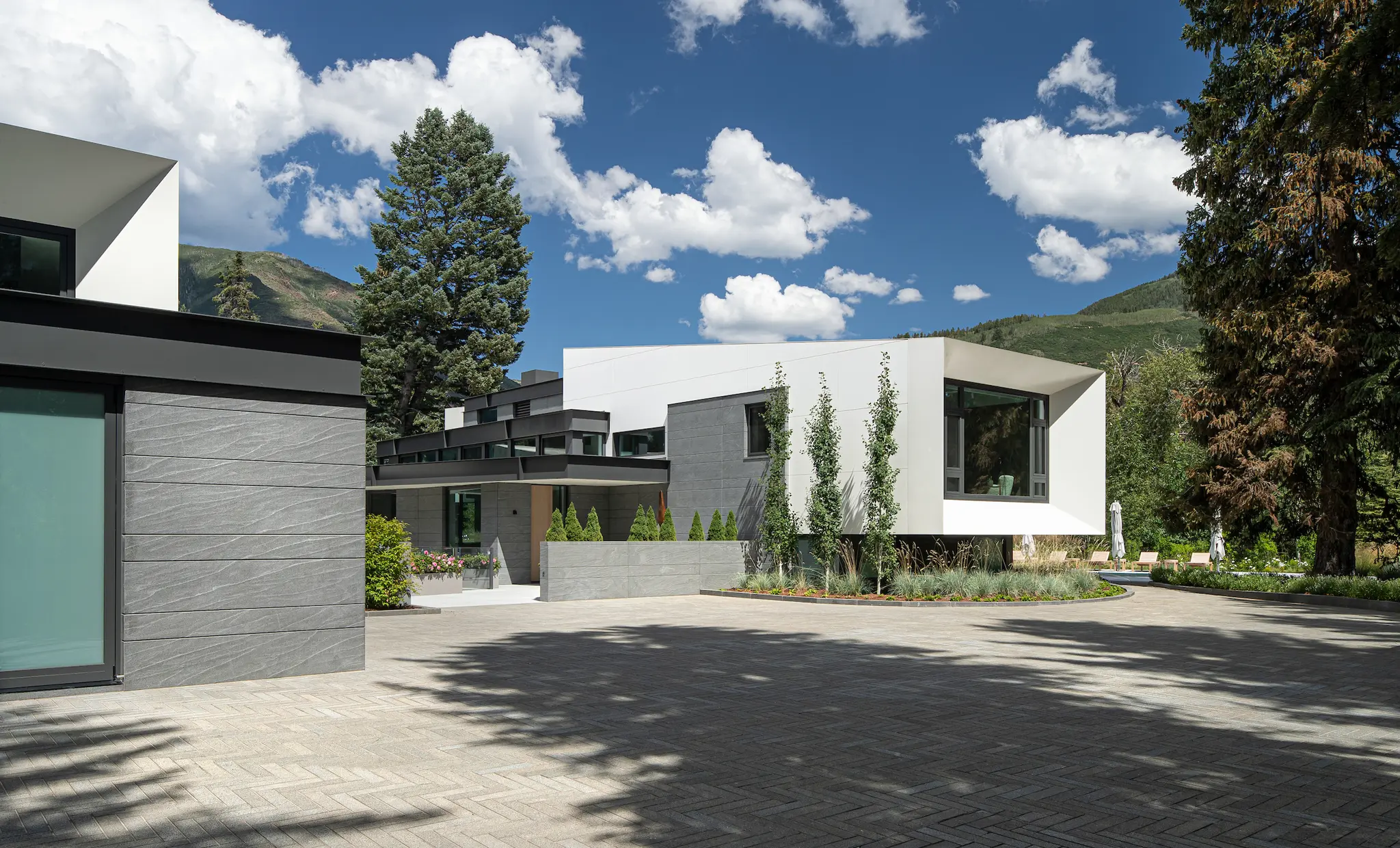 The scope also includes extensive exterior stone paving, incorporating large-format granite pavers for patios and a herringbone-patterned granite driveway. Through detailed coordination, mockups, and sequencing, the masonry work reinforces architectural continuity across the residence while delivering durability, craftsmanship, and a cohesive material expression throughout the site.