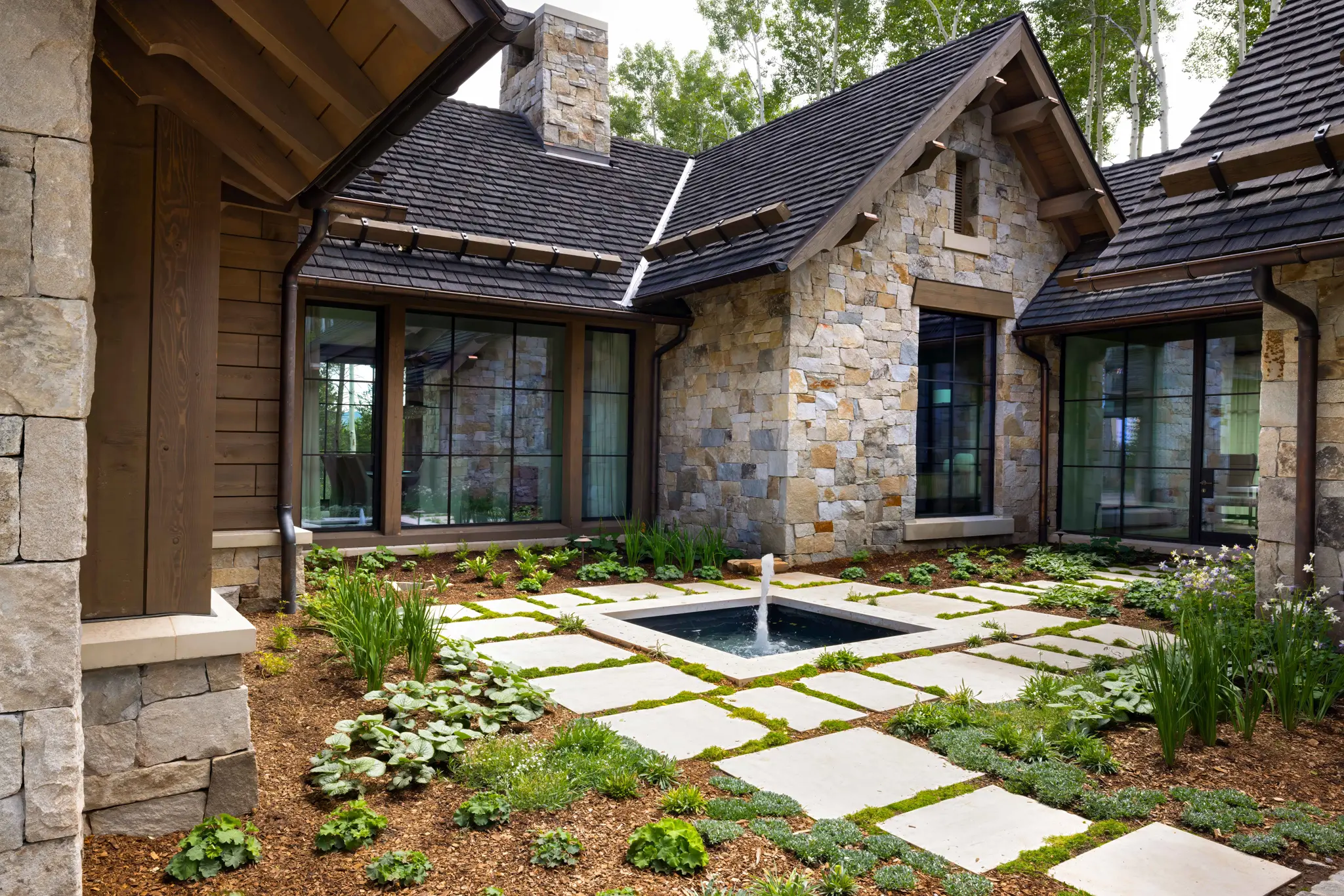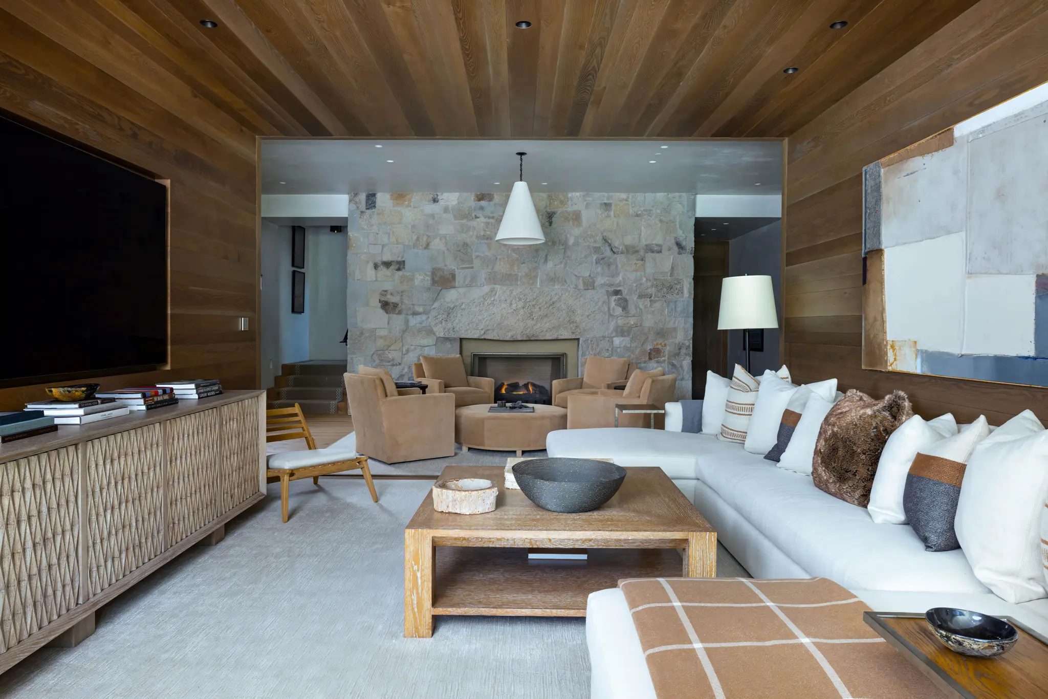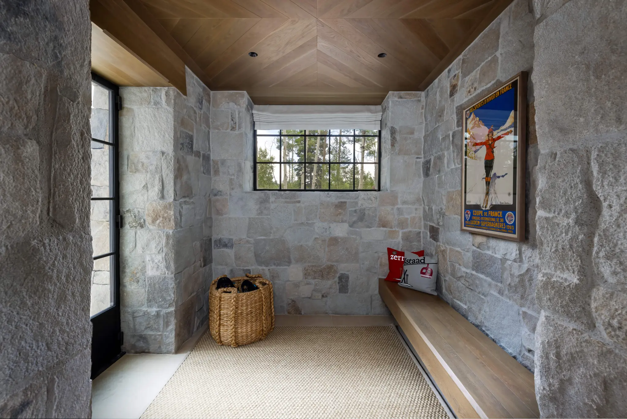 Stone elements anchor key spaces across wellness and gathering areas, including spa and sauna environments, fireplaces, and exterior features such as a private hot tub, water feature, and fire pit. The masonry work reinforces the home’s connection to its alpine setting while complementing the residence’s layered material palette of custom wood floors, veneered beams, and finely detailed millwork, resulting in a cohesive expression of mountain craftsmanship and material depth.